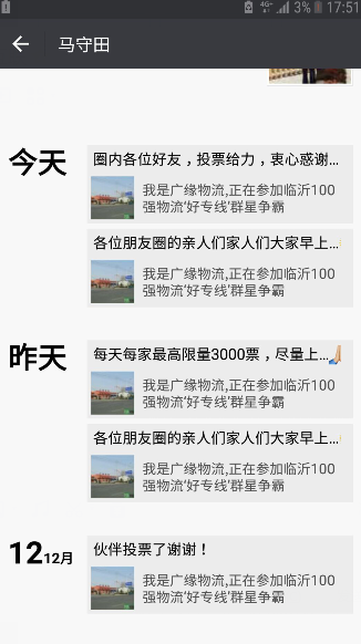 2017年12月4日,在为我园区华中物流投票时发现,我物流公司也在“群星争霸”的赛事中,票数为一千多票,排在第12名,当时非常激动,董事长马守田亲自组织,副总主持,召开广缘物流专线经理和各部门会议,专题研究利用此次赛事,把广缘物流积累的二十余年的能量发挥出来,把客户群体对广缘的信赖感调动起来,同时召开各分公司视频会议,让收货人对广缘物流做更加全面的评价。